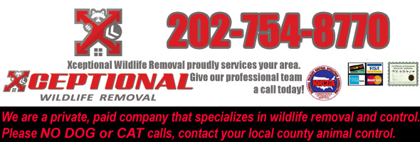 We are here to humanely and professionally solve your wildlife problem. Call Xceptional Wildlife Removal at 202-754-8770, and we will listen to your problem, give you a price quote, and