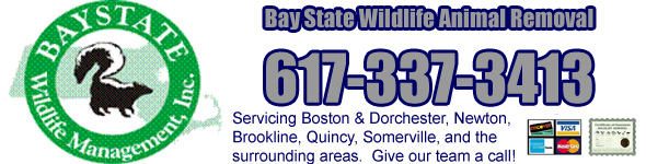 We are here to humanely and professionally solve your wildlife problem. Call Bay State Wildlife at 617-337-3413, and we will listen to your problem, give you a price quote, and