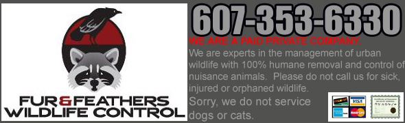 We are here to humanely and professionally solve your wildlife problem. Call Fur and Feathers Wildlife Control at 607-353-6330, and we will listen to your problem, give you a price quote, and